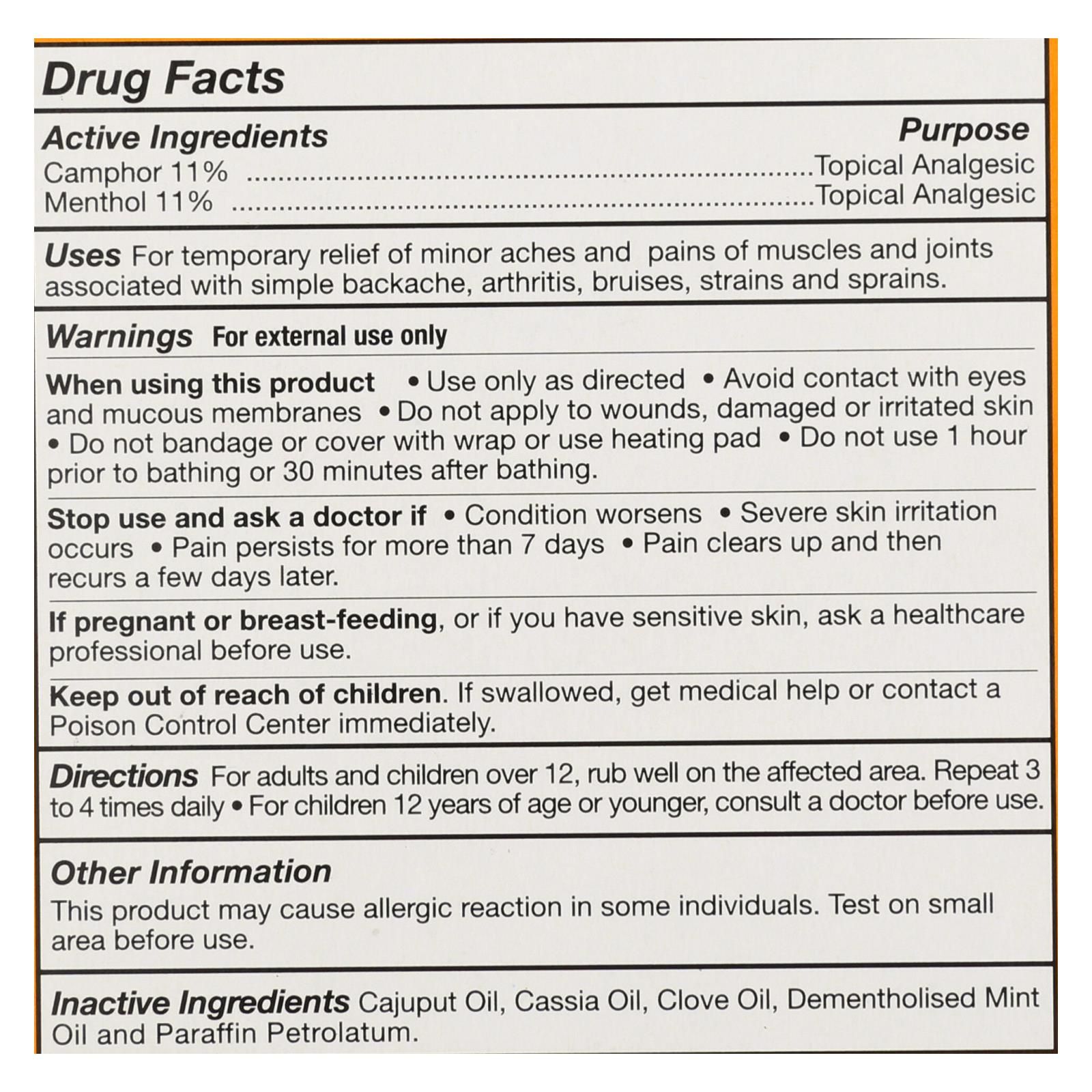 ingredients : drug facts active camphor 11% purpose topical analgesic menthol 11% purpose topical analgesic;inactive cajuput oil;cassia oil;clove oil;dementholised mint oil and paraffin petrolatum