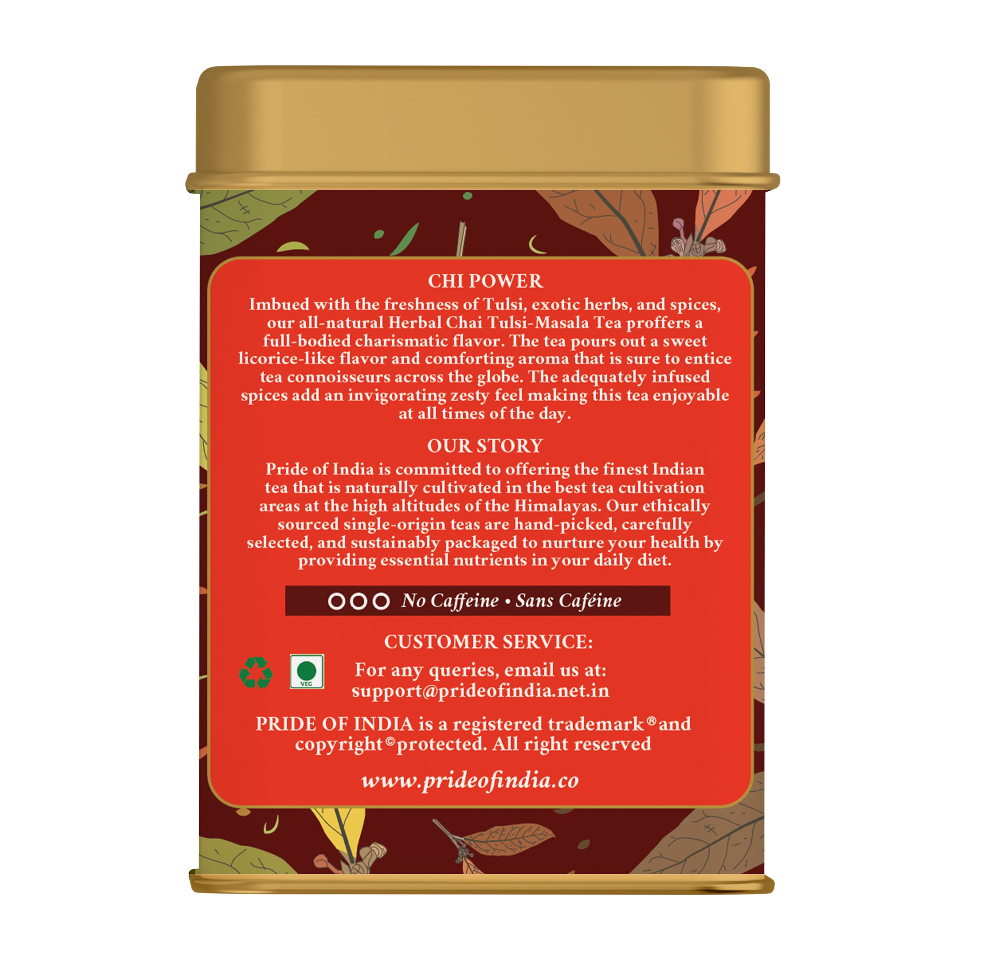 Our naturally decaf Herbal chai combines the benefits of the Tulsi Herbal tea with the aromas of the most exotic Indian herbs and spices like cinnamon, cardamom, clove and ginger. Its invigorating fragrance and zesty flavor connects you to the Indian culture, giving you a glimpse into our glorious heritage and colorful festivities. For a wholesome experience sweetener and creamer may be added.