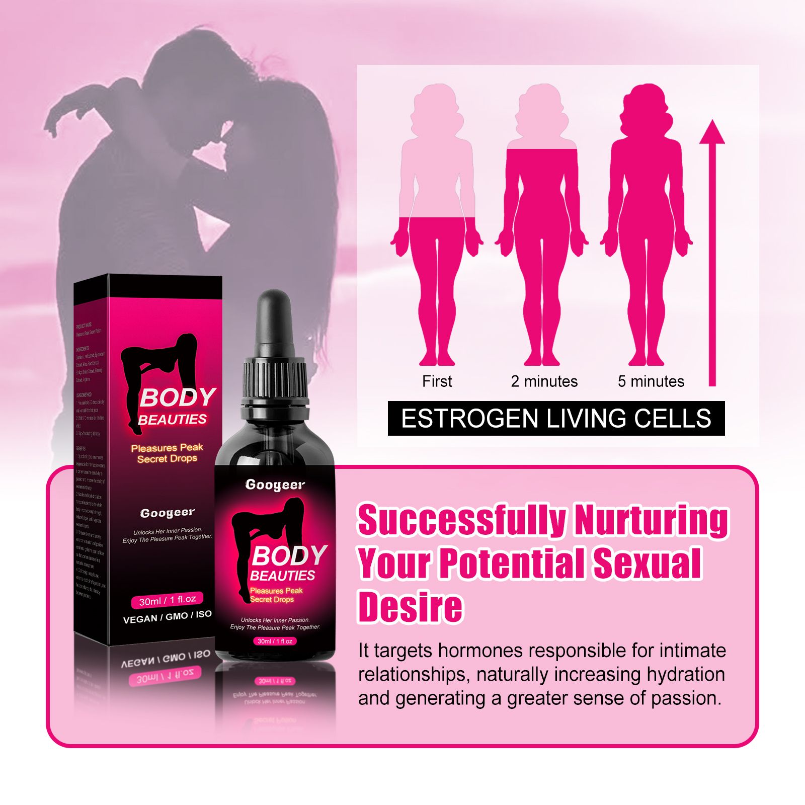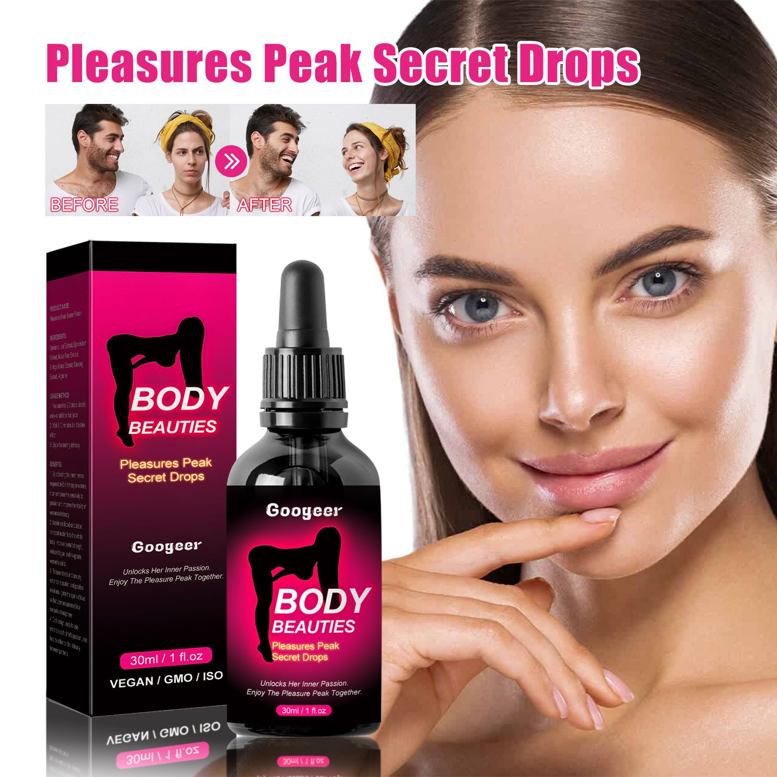 Our female care drops contain ginseng extract, ginkgo biloba extract and L-arginine. It can improve lubrication and activate excitation. Its usage is very simple: 1. You can take 2 to 3 drops directly orally or add fruit juice. It will take effect after 5 to 10 minutes. 3. Enjoy charming intimate relationships. And it can enhance the relationship, naturally increase the moisture, and generate greater passion.