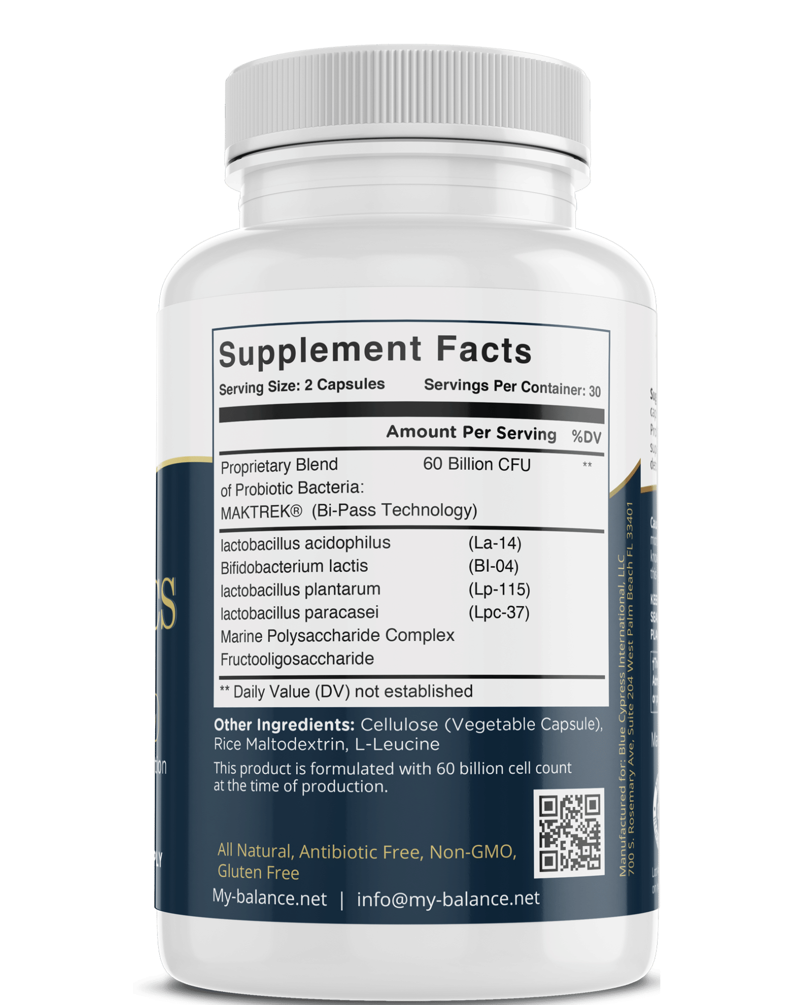 My Balance Probiotic 60 billion is a dietary supplement formulated with a blend of four probiotic strains, each contributing to a diverse probiotic profile. This product contains 60 billion CFU (colony-forming units) per serving and includes the following strains: