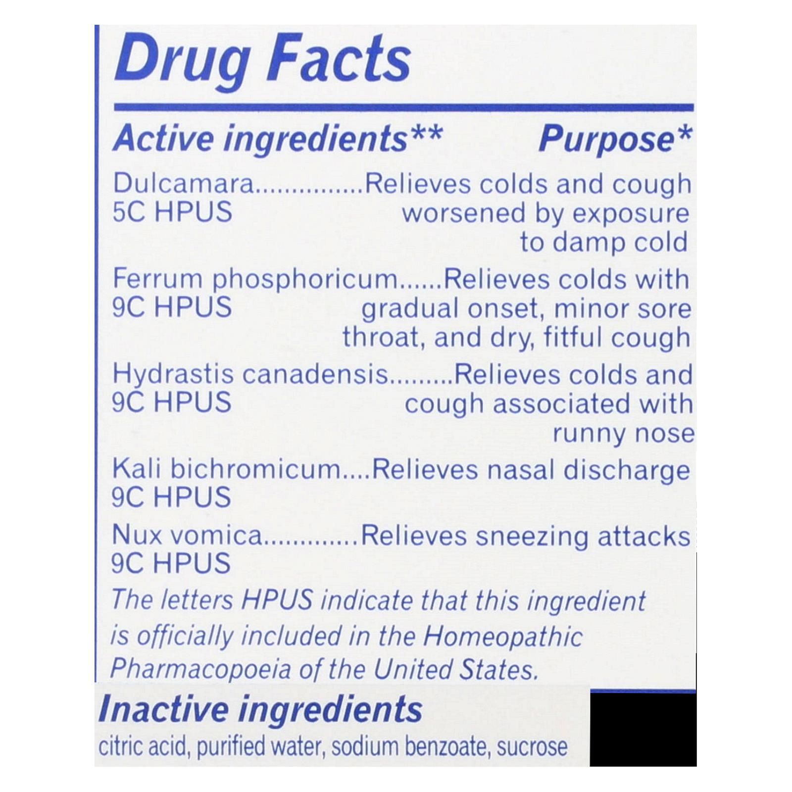 ingredients : active ** dulcamara 5c hpus purpose* relieves colds and cough worsened by exposure to damp cold ferrum phosphoricum 9c hpus relieves colds with gradual onset;minor sore throat;and dry;fitful cough hydrastis canadensis 9c hpus relieves colds and cough associated with runny nose kali bichromicum 9c hpus relieves nasal discharge nux vomica 9c hpus relieves sneezing attacks inactive citric acid;purified water;sodium benzoate;sucrose