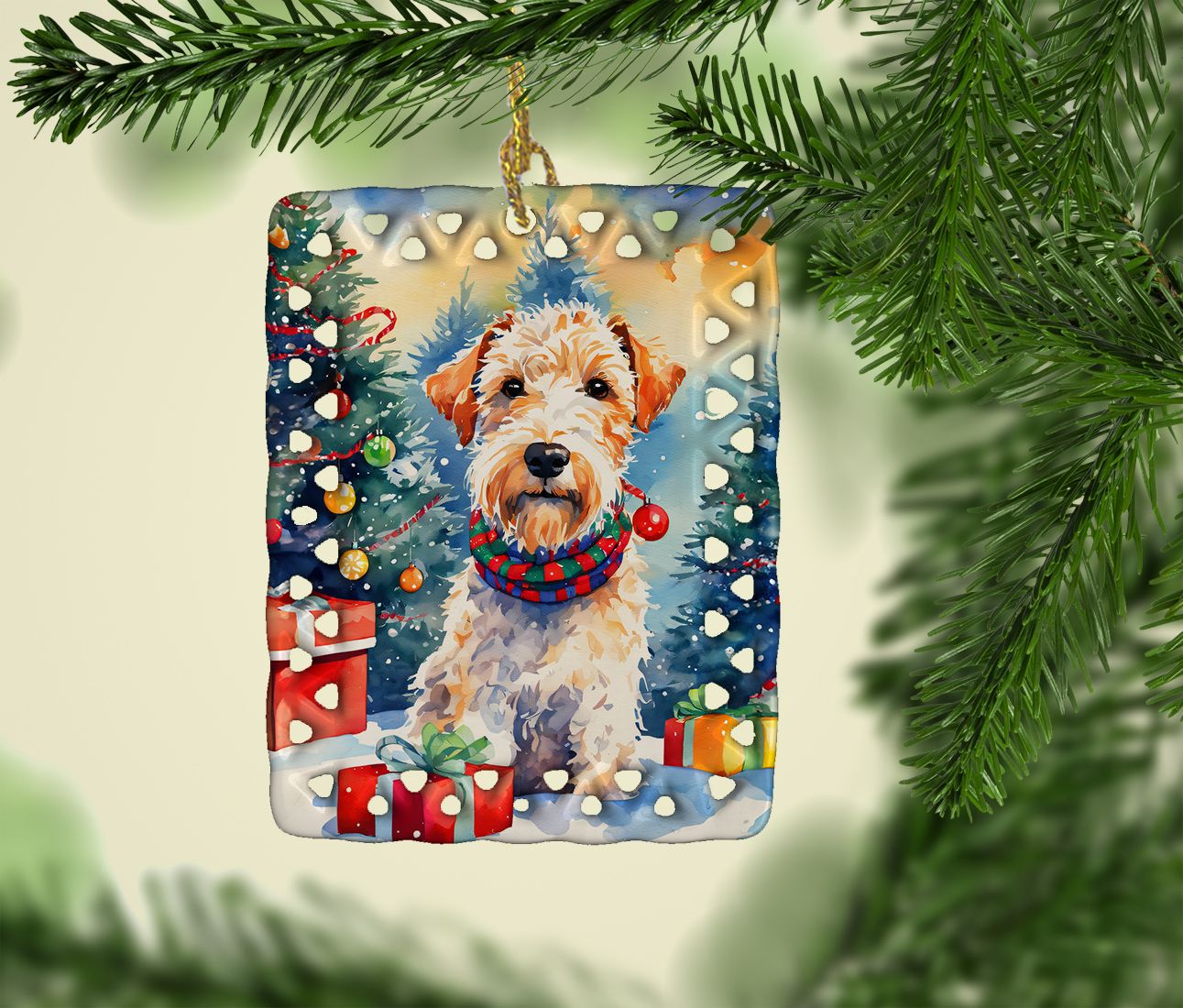 Porcelain Ornament featuring breed specific Wire Fox Terrier artwork. Celebrate Christmas with this Christmas Ornament. Add a unique, personal touch to your holiday decor with our Rectangular Lattice Porcelain Ornament. Perfect for creating cherished memories, this high-quality ornament shines under festive lights, reflecting warmth and joy throughout your Christmas tree. Crafted with a glossy finish, it showcases vibrant, full-color artwork contributed by our talented artists, ensuring your tree is adorned with a burst of color and holiday spirit. What sets this Porcelain Ornament apart is its customizable white back. Use a paint pen or permanent marker to write a heartfelt message, commemorate a special year, or mark an unforgettable date, turning this ornament into a keepsake that will be treasured for years to come. For best results, allow any personalization to dry thoroughly before handling. Each ornament comes complete with a delicate gold cord, making it easy to hang and display. Proudly made in the USA, this ornament measures 3.375 x 2.625 inches and is a thoughtful gift for pet sitters, teachers, family members, or anyone who would appreciate a little extra holiday magic. Bring style, charm, and a touch of personal meaning to your Christmas tree with this beautifully designed ornament..