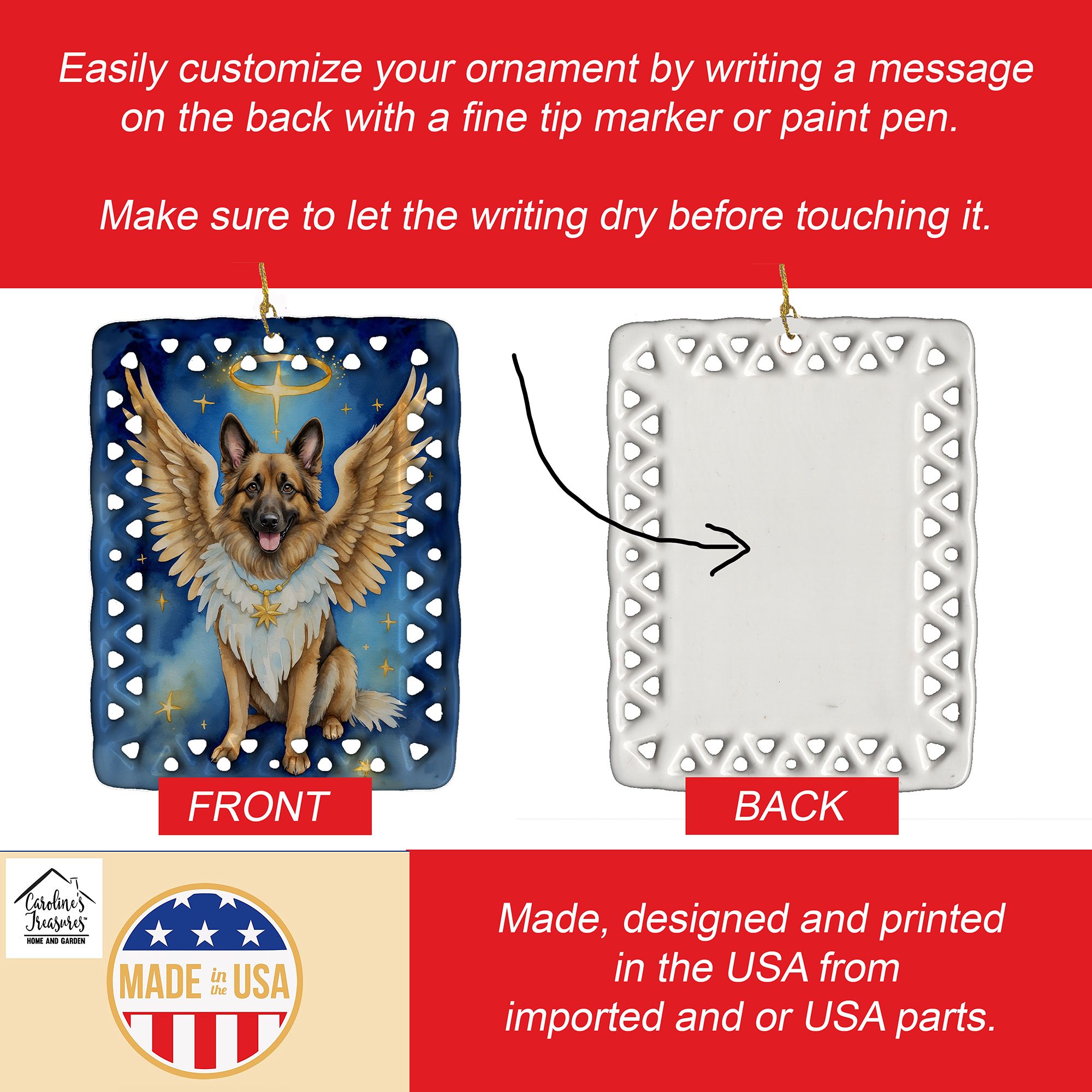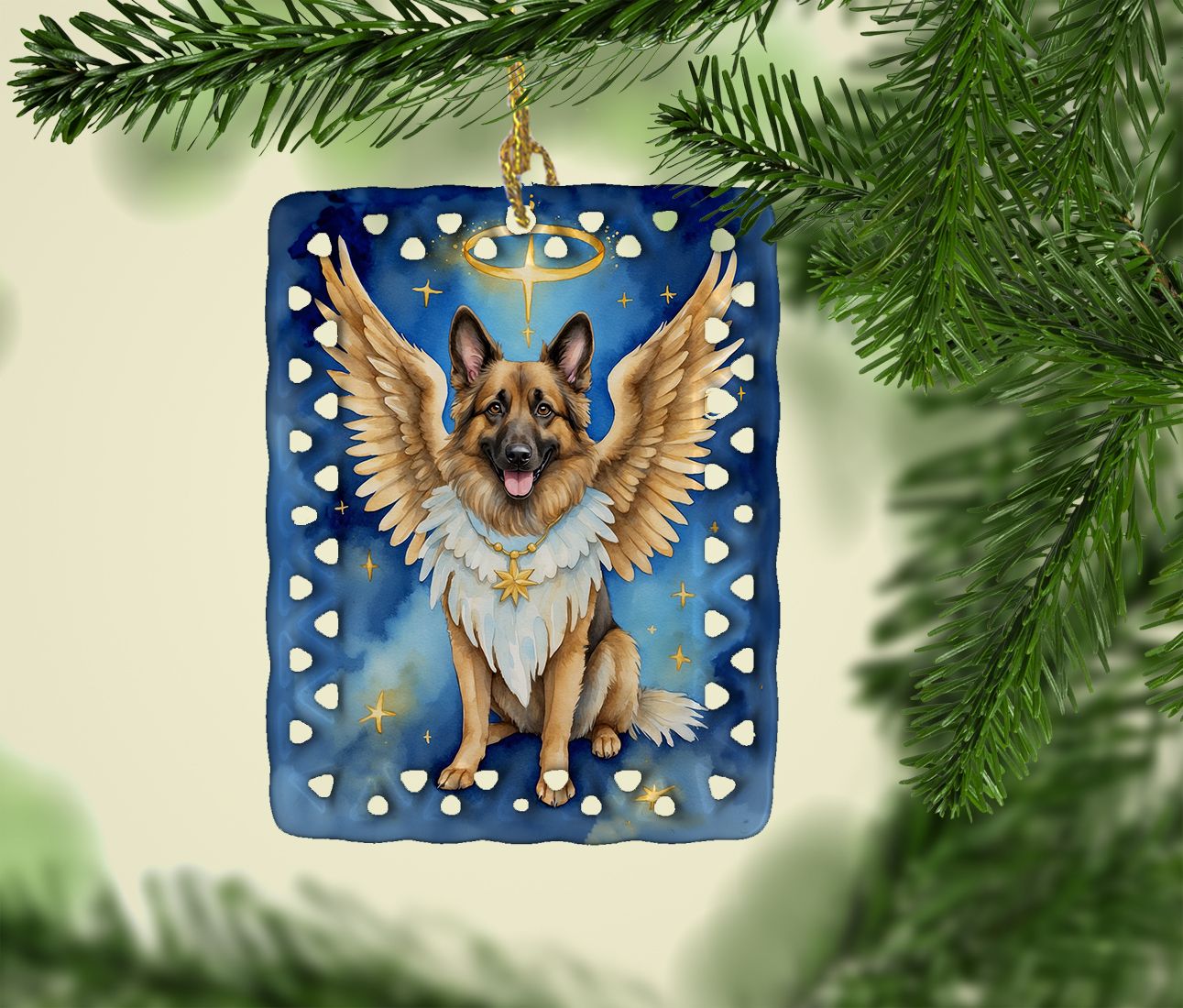 Porcelain Ornament featuring breed specific Belgian Tervuren artwork. Celebrate Christmas with this Christmas Ornament. Add a unique, personal touch to your holiday decor with our Rectangular Lattice Porcelain Ornament. Perfect for creating cherished memories, this high-quality ornament shines under festive lights, reflecting warmth and joy throughout your Christmas tree. Crafted with a glossy finish, it showcases vibrant, full-color artwork contributed by our talented artists, ensuring your tree is adorned with a burst of color and holiday spirit. What sets this Porcelain Ornament apart is its customizable white back. Use a paint pen or permanent marker to write a heartfelt message, commemorate a special year, or mark an unforgettable date, turning this ornament into a keepsake that will be treasured for years to come. For best results, allow any personalization to dry thoroughly before handling. Each ornament comes complete with a delicate gold cord, making it easy to hang and display. Proudly made in the USA, this ornament measures 3.375 x 2.625 inches and is a thoughtful gift for pet sitters, teachers, family members, or anyone who would appreciate a little extra holiday magic. Bring style, charm, and a touch of personal meaning to your Christmas tree with this beautifully designed ornament..