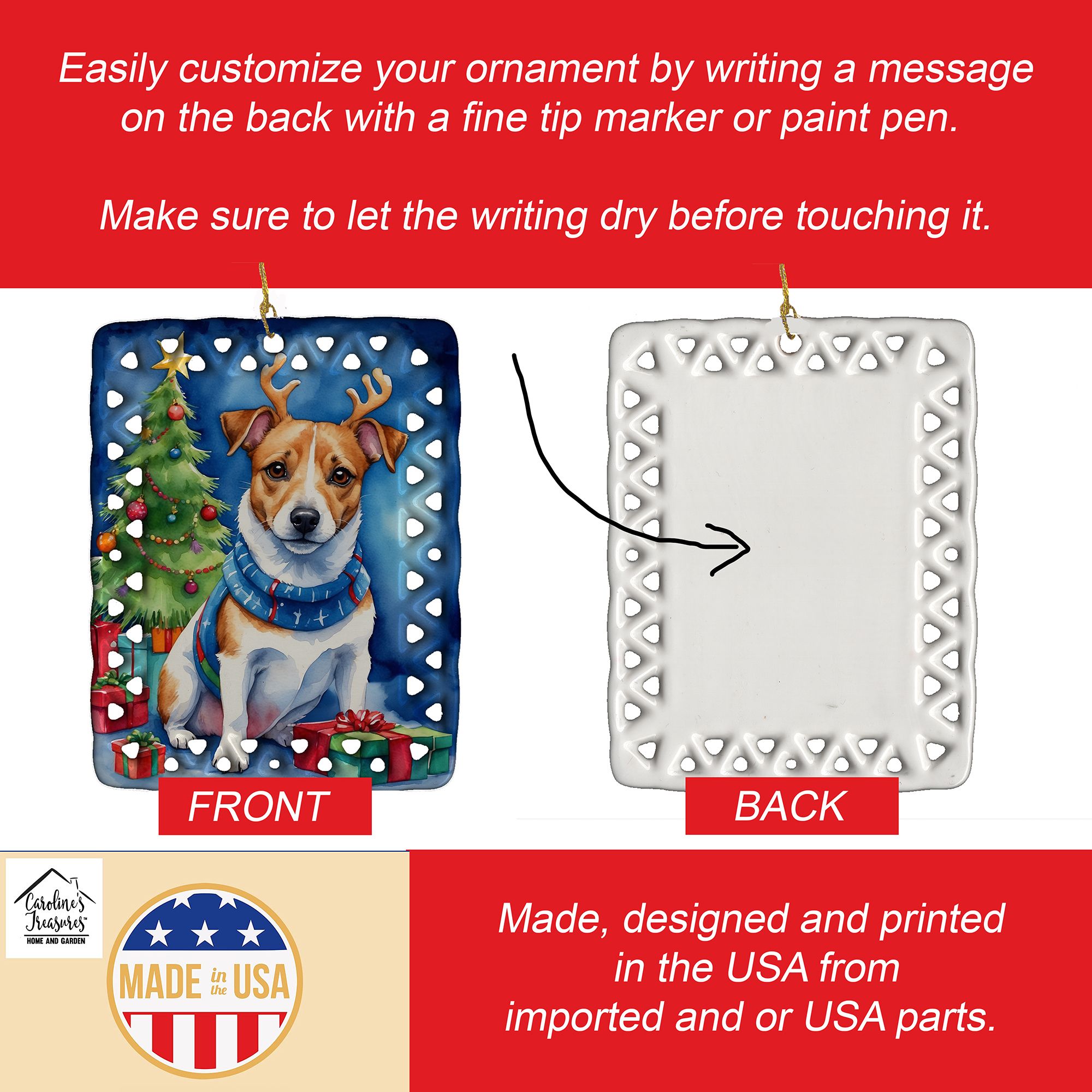 Porcelain Ornament featuring breed specific Jack Russell Terrier artwork. Celebrate Christmas with this Christmas Ornament. Add a unique, personal touch to your holiday decor with our Rectangular Lattice Porcelain Ornament. Perfect for creating cherished memories, this high-quality ornament shines under festive lights, reflecting warmth and joy throughout your Christmas tree. Crafted with a glossy finish, it showcases vibrant, full-color artwork contributed by our talented artists, ensuring your tree is adorned with a burst of color and holiday spirit. What sets this Porcelain Ornament apart is its customizable white back. Use a paint pen or permanent marker to write a heartfelt message, commemorate a special year, or mark an unforgettable date, turning this ornament into a keepsake that will be treasured for years to come. For best results, allow any personalization to dry thoroughly before handling. Each ornament comes complete with a delicate gold cord, making it easy to hang and display. Proudly made in the USA, this ornament measures 3.375 x 2.625 inches and is a thoughtful gift for pet sitters, teachers, family members, or anyone who would appreciate a little extra holiday magic. Bring style, charm, and a touch of personal meaning to your Christmas tree with this beautifully designed ornament..