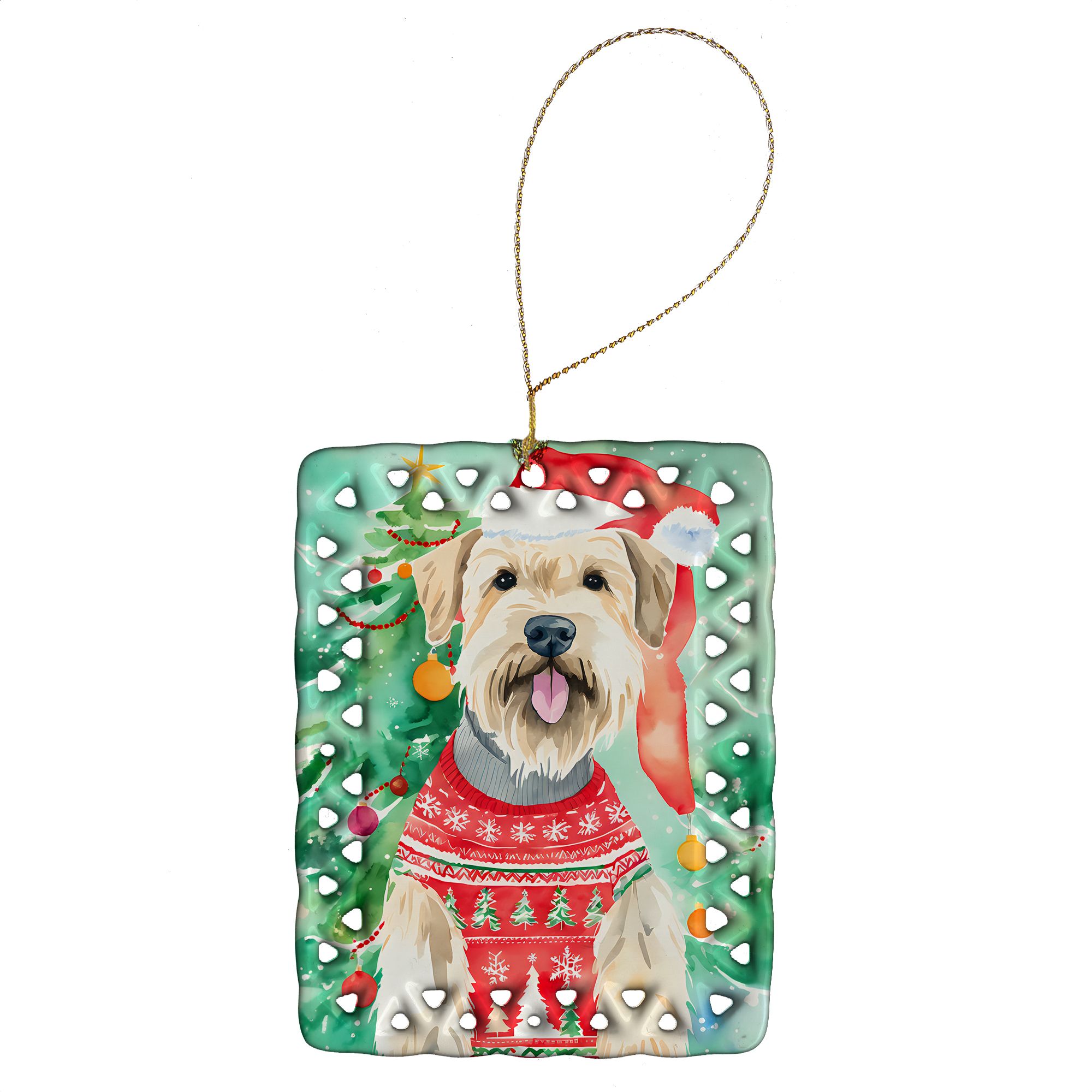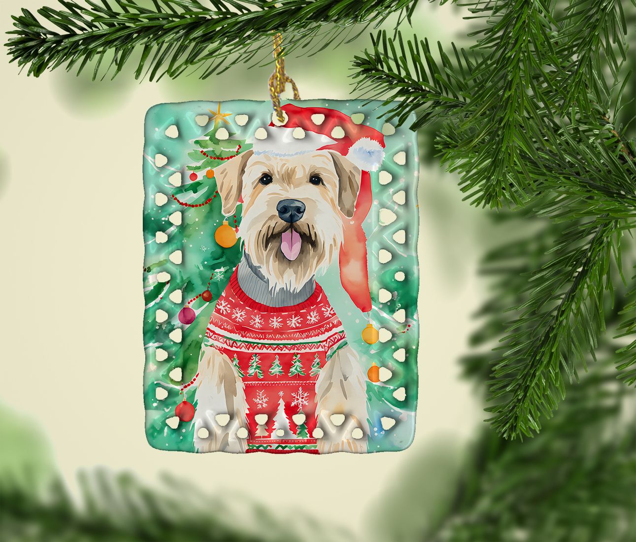 Porcelain Ornament featuring breed specific Soft Coated Wheaten Terrier artwork. Celebrate Christmas with this Christmas Ornament. Add a unique, personal touch to your holiday decor with our Rectangular Lattice Porcelain Ornament. Perfect for creating cherished memories, this high-quality ornament shines under festive lights, reflecting warmth and joy throughout your Christmas tree. Crafted with a glossy finish, it showcases vibrant, full-color artwork contributed by our talented artists, ensuring your tree is adorned with a burst of color and holiday spirit. What sets this Porcelain Ornament apart is its customizable white back. Use a paint pen or permanent marker to write a heartfelt message, commemorate a special year, or mark an unforgettable date, turning this ornament into a keepsake that will be treasured for years to come. For best results, allow any personalization to dry thoroughly before handling. Each ornament comes complete with a delicate gold cord, making it easy to hang and display. Proudly made in the USA, this ornament measures 3.375 x 2.625 inches and is a thoughtful gift for pet sitters, teachers, family members, or anyone who would appreciate a little extra holiday magic. Bring style, charm, and a touch of personal meaning to your Christmas tree with this beautifully designed ornament..