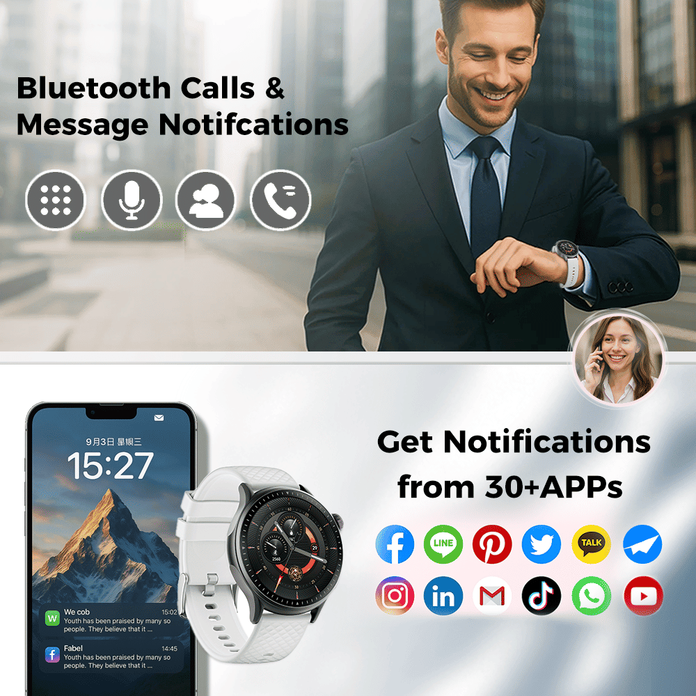 1.DISPLAY FEATURES:Round screen smartwatch with clear interface for easy navigation and comfortable viewing of notifications and health metrics