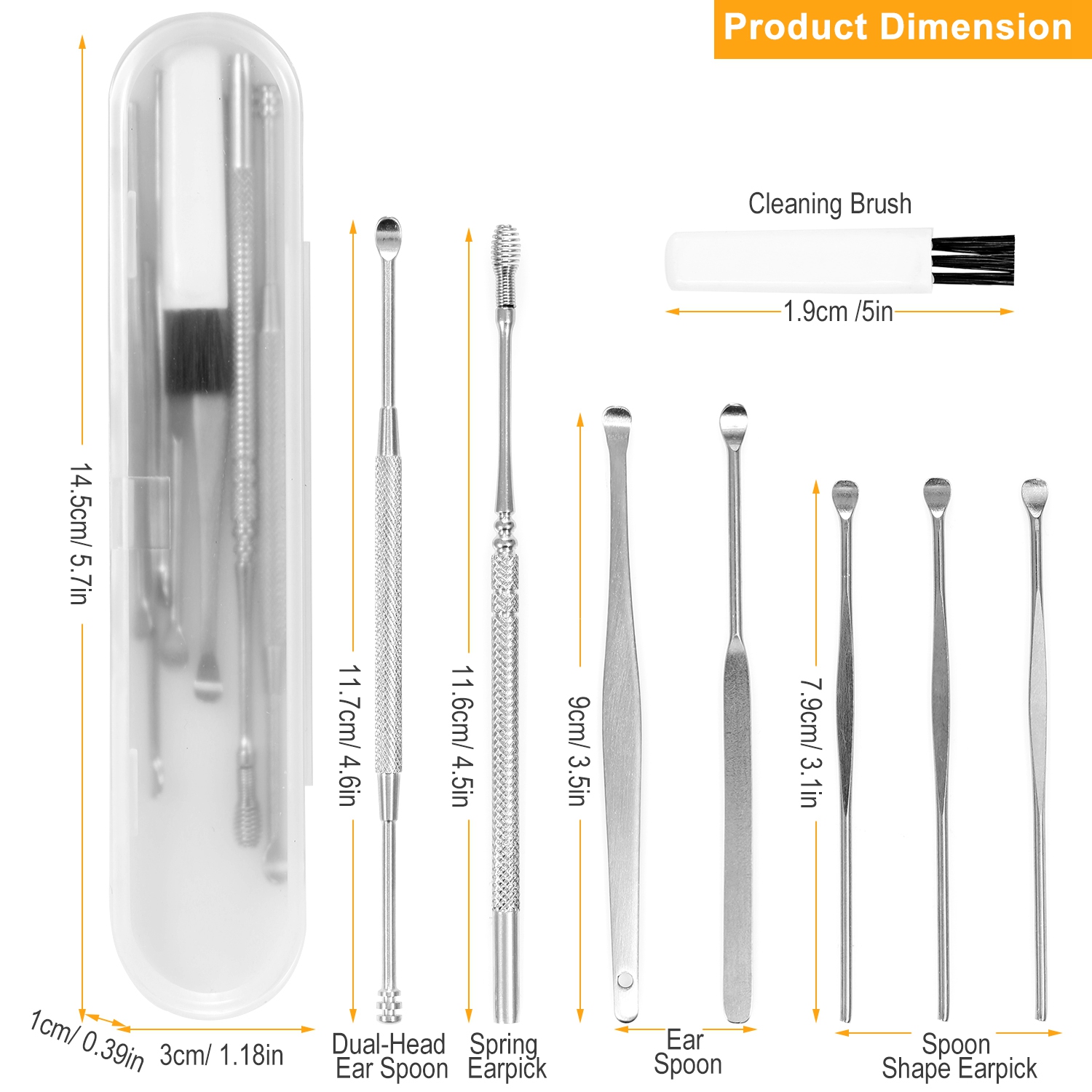 Item Size (L*W*H): 3.1in/7.9cm (3 Spoon Shape Earpick), 3.5in/9cm (2 Ear Spoon), 4.6in/11.7cm (Dual-Head Ear Spoon), 4.5in/11.6cm (Spring Earpick), and 1.9in/5 cm (Cleaning Brush)