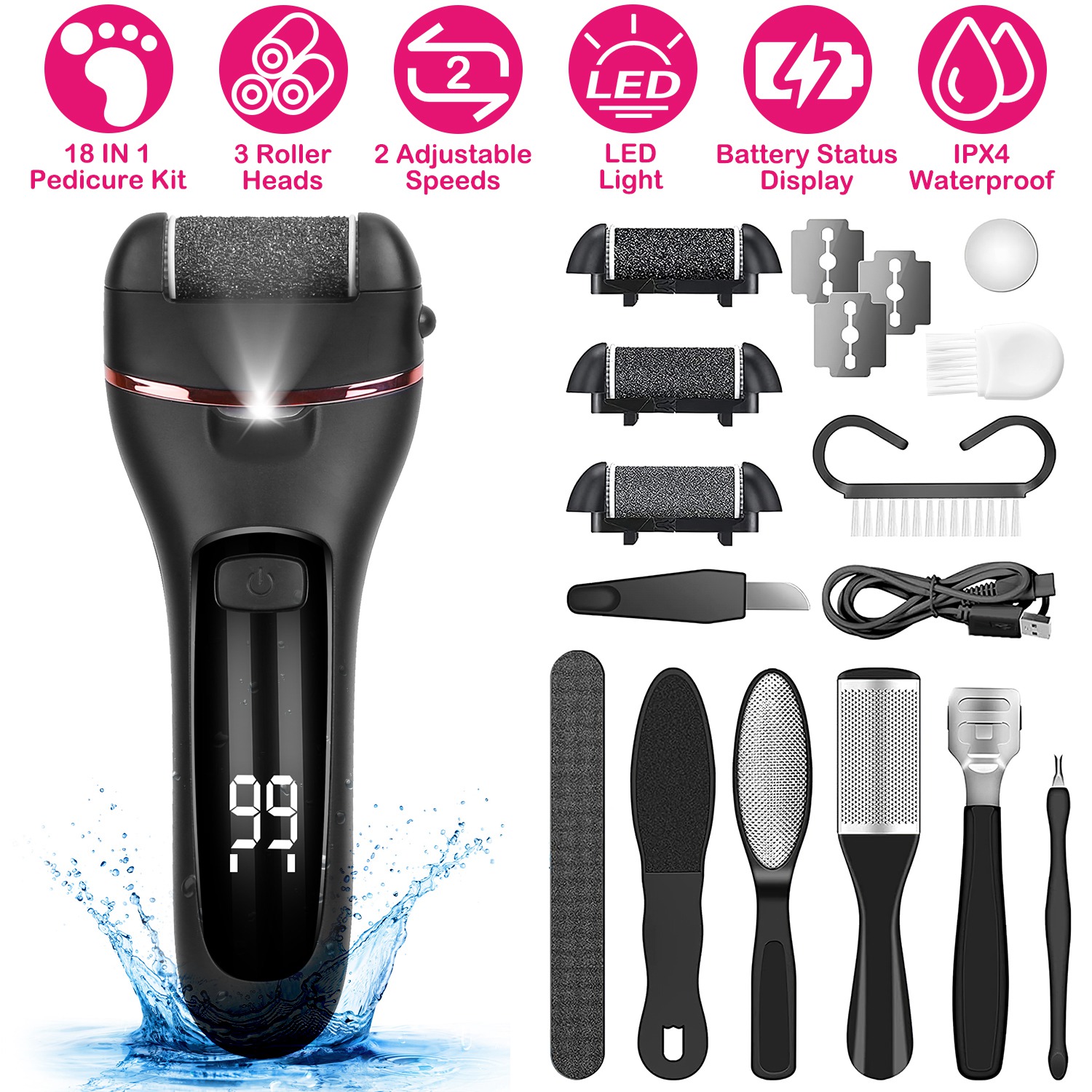 Home > Electric Foot Callus Remover Foot Grinder Rechargeable Foot File Dead Skin Pedicure Machine w/ 3 Roller Heads 2 Speeds 18 in 1 Foot Care Tool