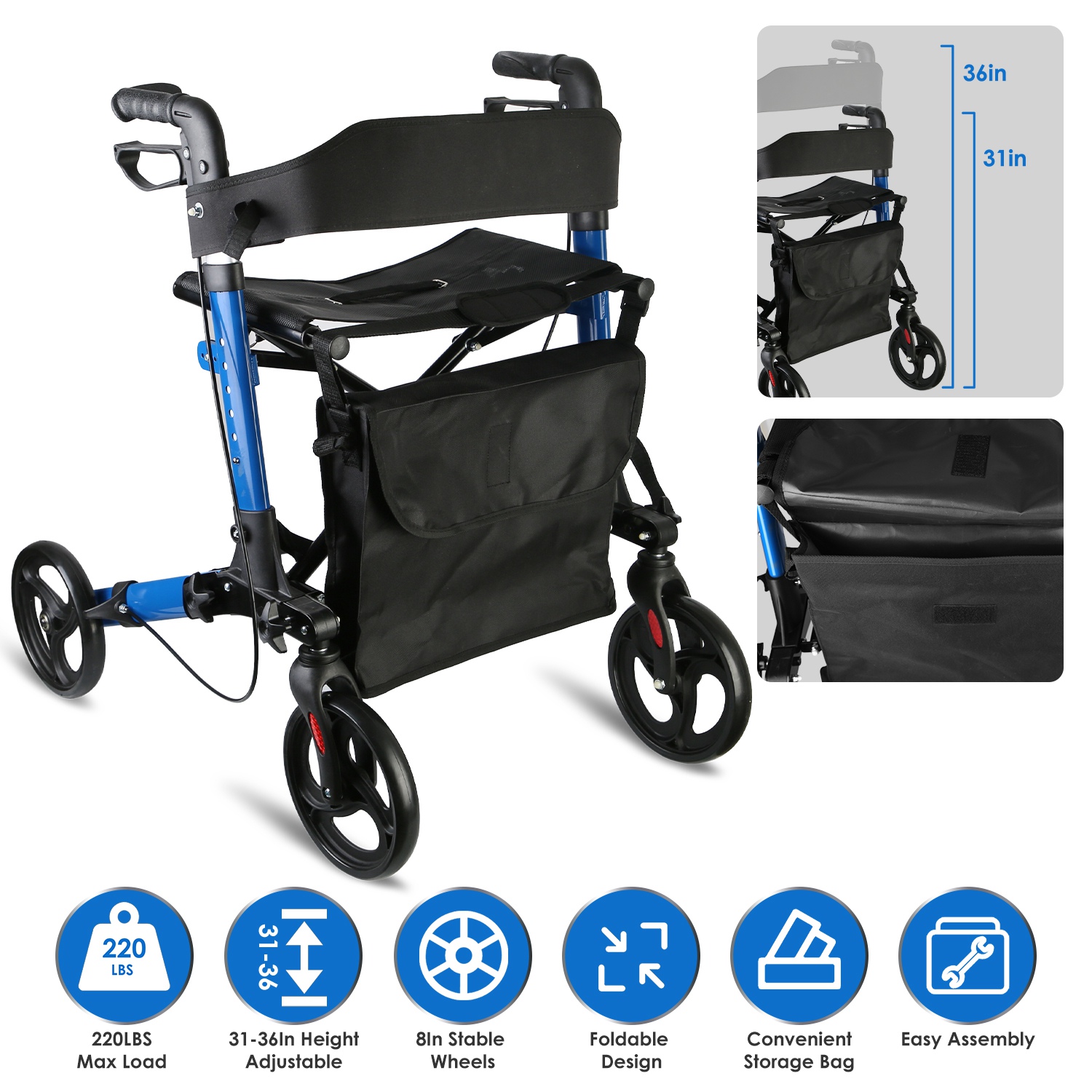 Home > Aluminum Rollator Walker with Seat Backrest Foldable Rolling Walker with 220LBS Max Load 31-36in Adjustable Height 8in Wheels for Seniors Adult Mobili