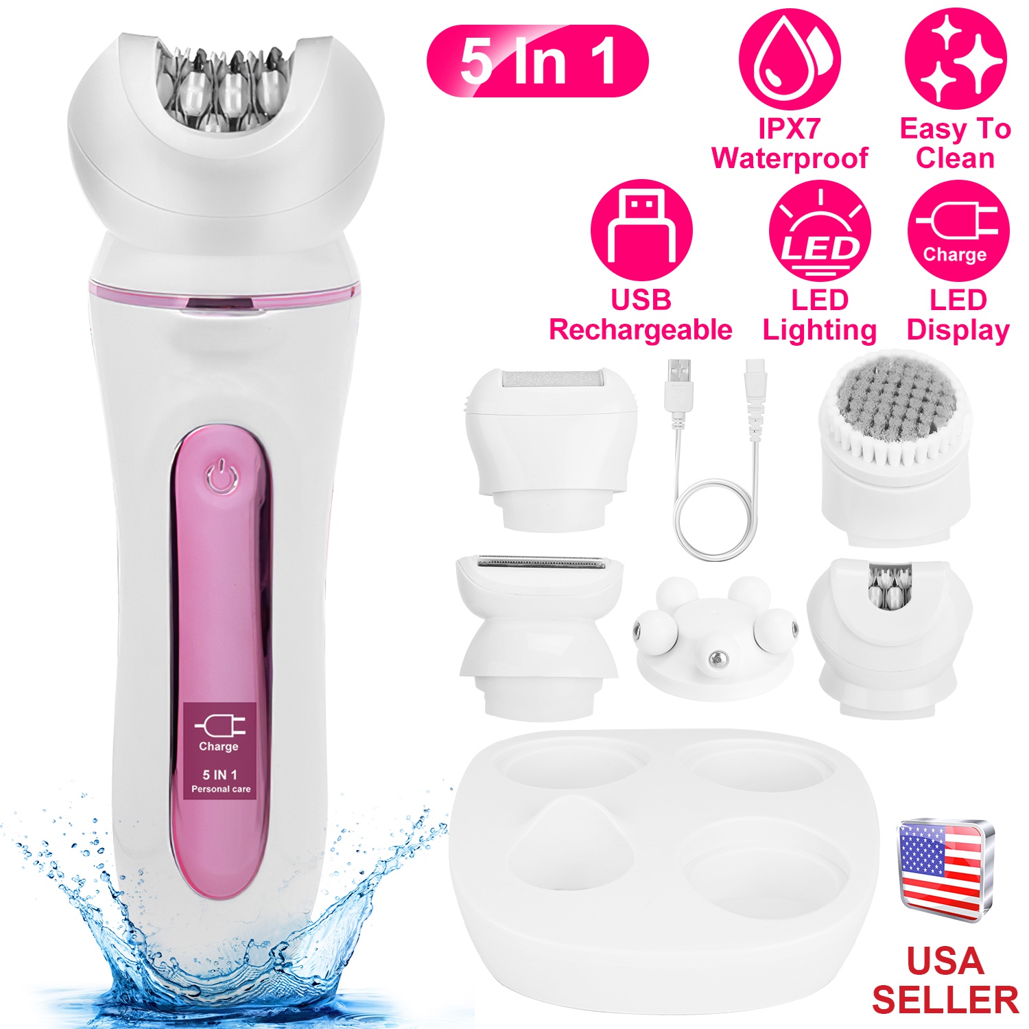 5 In 1 Electric Body Epilator Rechargeable Women's Grooming Kit Epilator Shaver Facial Brush Callus Remover 5-Point Massager with LED Light LED Displ