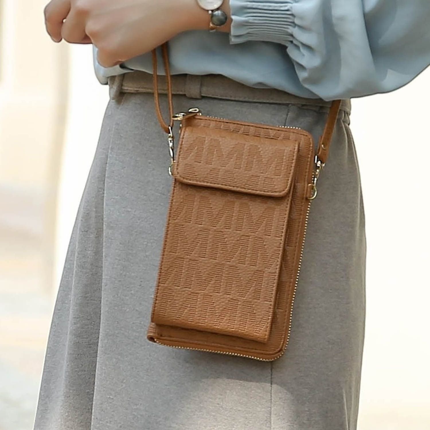 When the moment calls for just the essentials, our compact Caddy Phone Wallet Crossbody bag is a sleek choice. Crafted from high-quality vegan leather and embossed with our M signature, this bag is perfect when you want to travel light. The front magnetic snap pocket is sized to hold a smartphone, while a zip-around closure wallet opens to a spacious compartment with 12 card slots, 2 full bill compartments, and a mid-centered zipper pocket. Remove the detachable and adjustable strap when you want to simply slip this slim silhouette into a tote bag or just attach the wristlet strap.