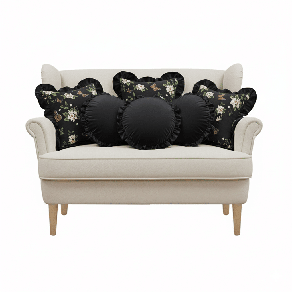 Elegant Vintage Design: Combination of embroidered square pillowcases and lotus edge round pillowcases with butterfly accents.