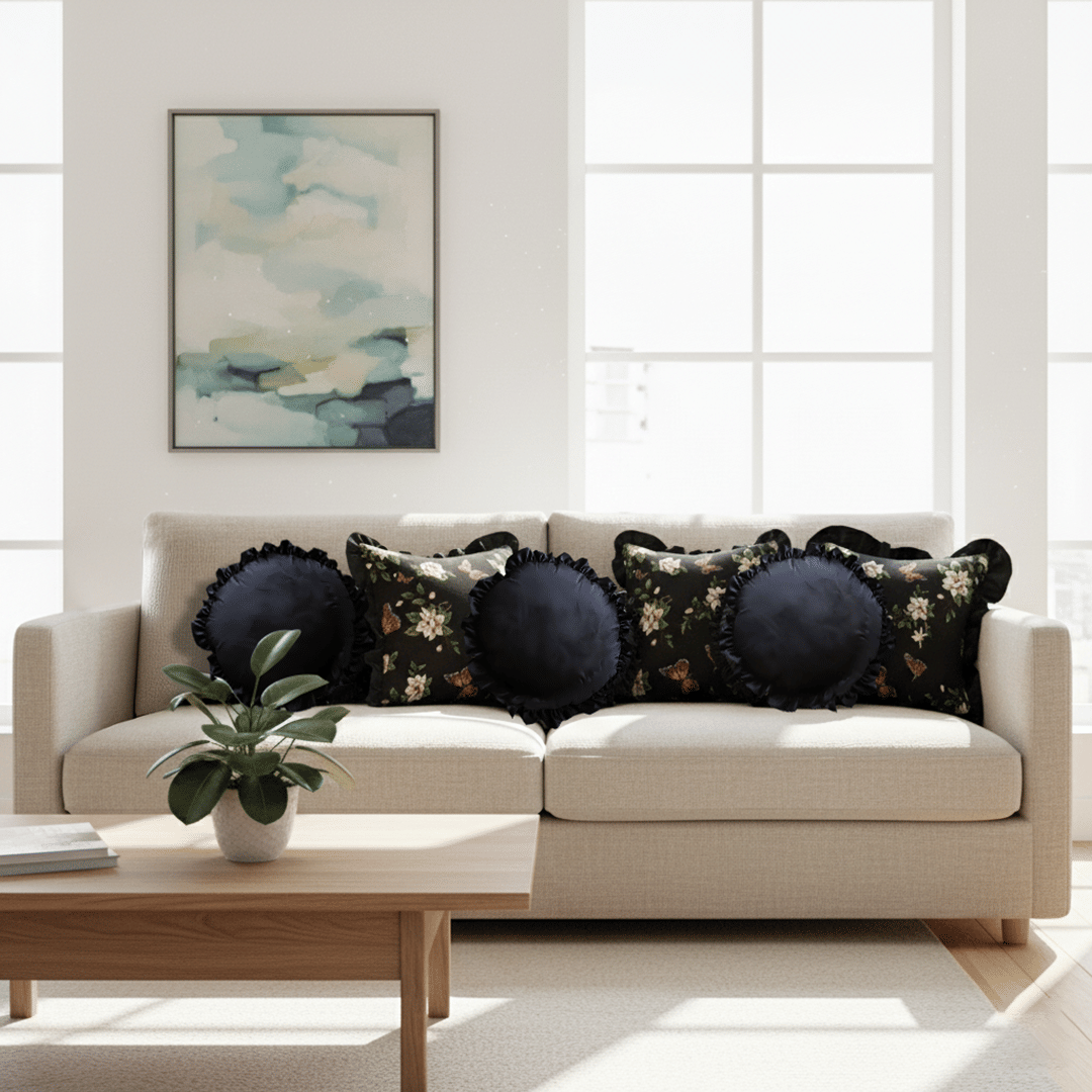 3 × 45cm Black Lotus Edge Round Pillowcases with Butterfly Accent