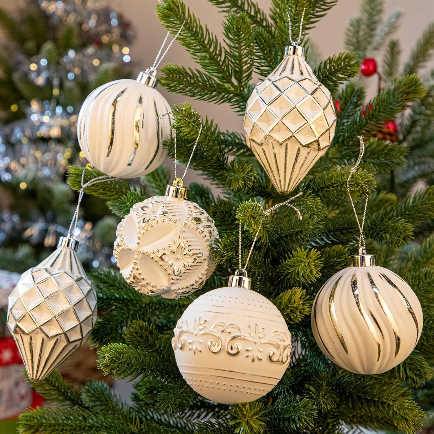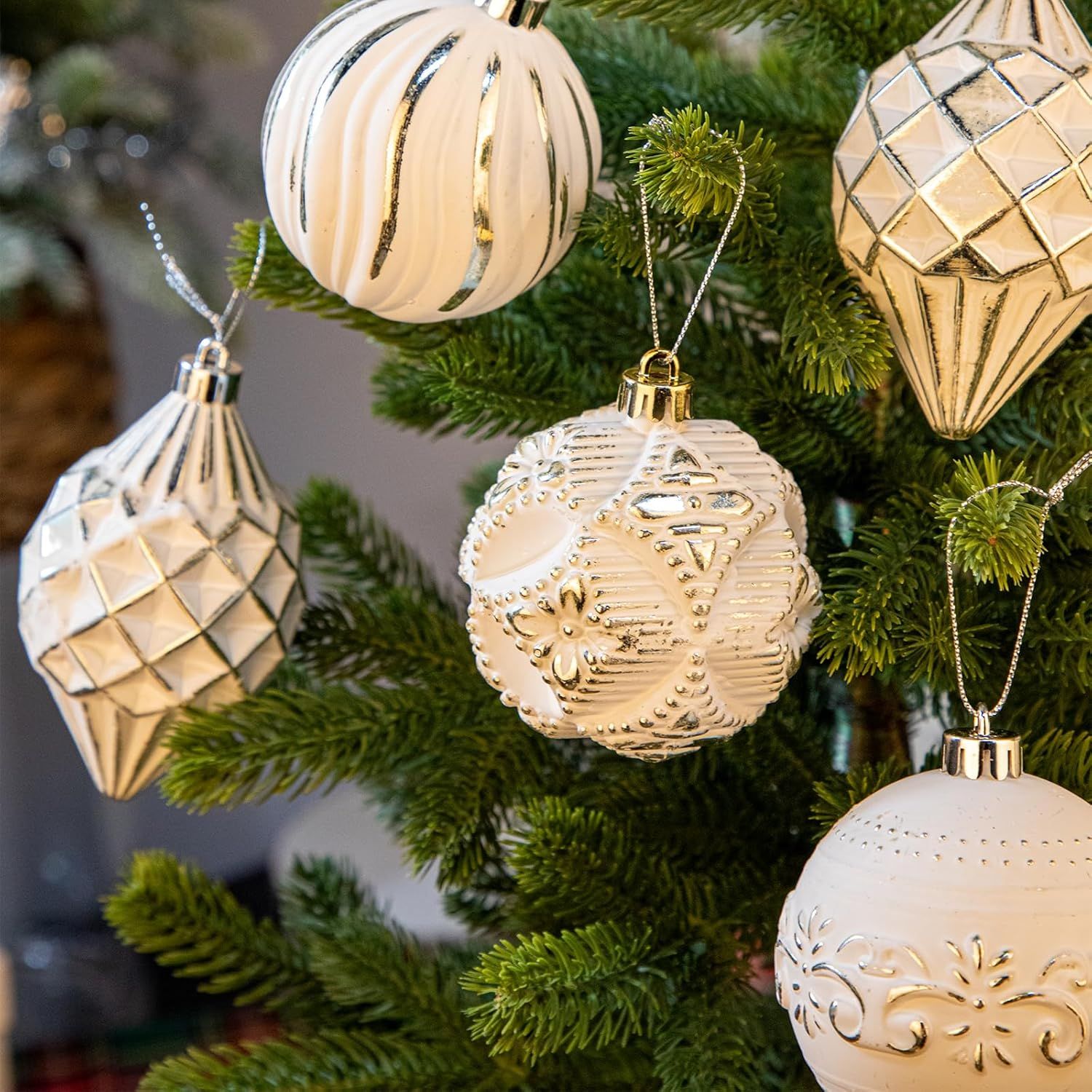 ELEGANT CHRISTMAS ORNAMENT SET: This set of 16 premium Christmas ball ornaments in assorted designs and sizes adds a touch of sophistication to any holiday decor. Available in 8 vibrant colors, including White, Pink, Red, Champagne, Gold, Green, Blue, and Bronze, they offer versatility for different holiday themesASSORTED SIZES FOR A BALANCED LOOK: The set includes four distinct ornament shapes and sizes, from 2.4 inches to 4.5 inches in height, ensuring a beautifully balanced appearance on your Christmas tree. These varying shapes create visual interest, adding depth and charm to your holiday displayHIGH-QUALITY SHATTERPROOF MATERIAL: Made from durable, shatterproof material, these Christmas decorations combine the beauty and shine of real glass with the resilience of plastic. This makes them safe for households with children and pets while retaining a festive, high-end appearanceINTRICATE HAND-PAINTED DESIGNS: Each ornament features intricate hand-painted designs with elegant details and shimmering accents. The delicate patterns bring a refined and unique touch, making this Christmas ball set a standout addition to any holiday decor collectionCONVENIENT STORAGE BOX INCLUDED: The set comes in a sturdy, reusable storage box, perfect for keeping the ornaments safe and organized after the holiday season. Each ornament is secured in its own compartment, preventing damage and ensuring easy storage year after year