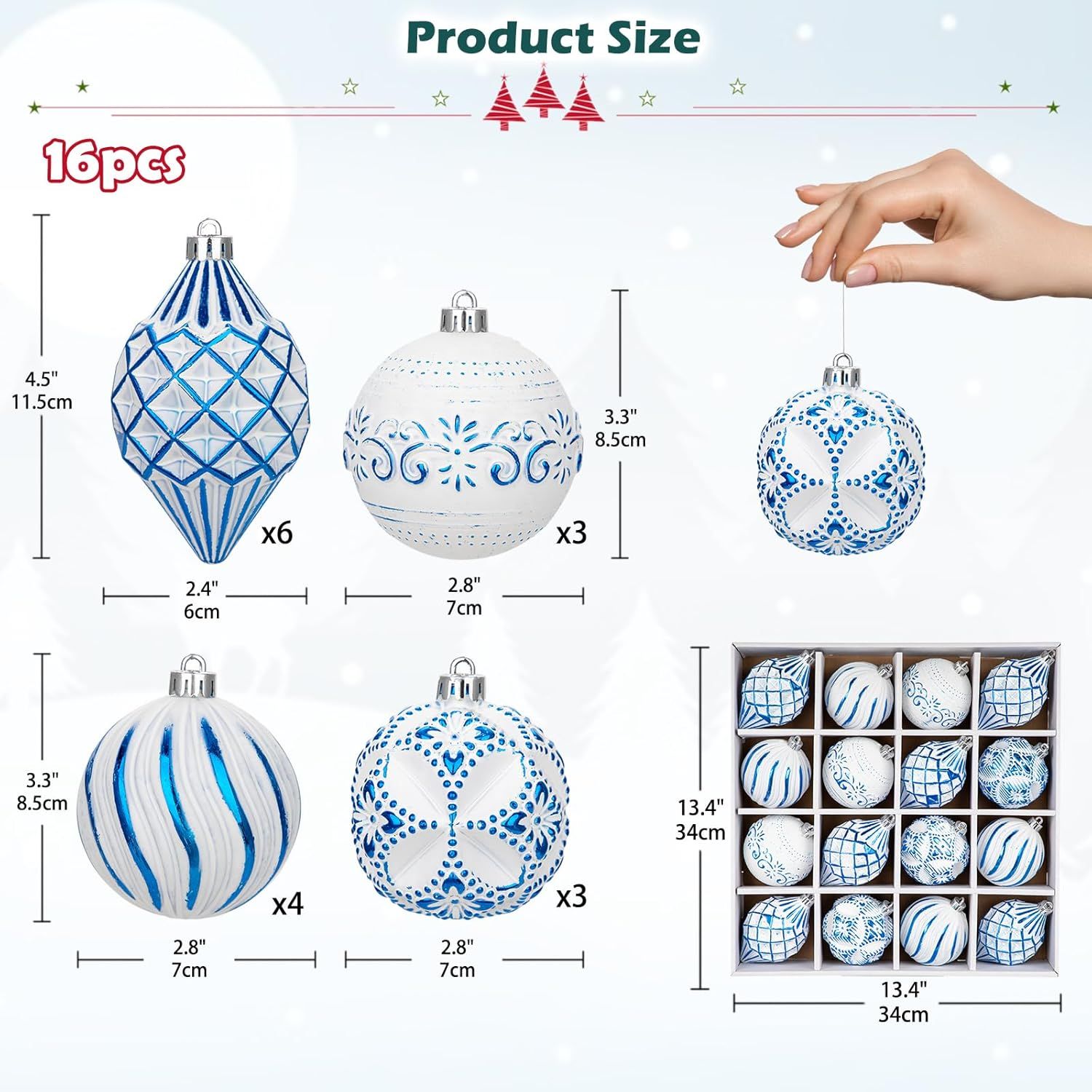 ELEGANT CHRISTMAS ORNAMENT SET: This set of 16 premium Christmas ball ornaments in assorted designs and sizes adds a touch of sophistication to any holiday decor. Available in 8 vibrant colors, including White, Pink, Red, Champagne, Gold, Green, Blue, and Bronze, they offer versatility for different holiday themesASSORTED SIZES FOR A BALANCED LOOK: The set includes four distinct ornament shapes and sizes, from 2.4 inches to 4.5 inches in height, ensuring a beautifully balanced appearance on your Christmas tree. These varying shapes create visual interest, adding depth and charm to your holiday displayHIGH-QUALITY SHATTERPROOF MATERIAL: Made from durable, shatterproof material, these Christmas decorations combine the beauty and shine of real glass with the resilience of plastic. This makes them safe for households with children and pets while retaining a festive, high-end appearanceINTRICATE HAND-PAINTED DESIGNS: Each ornament features intricate hand-painted designs with elegant details and shimmering accents. The delicate patterns bring a refined and unique touch, making this Christmas ball set a standout addition to any holiday decor collectionCONVENIENT STORAGE BOX INCLUDED: The set comes in a sturdy, reusable storage box, perfect for keeping the ornaments safe and organized after the holiday season. Each ornament is secured in its own compartment, preventing damage and ensuring easy storage year after year