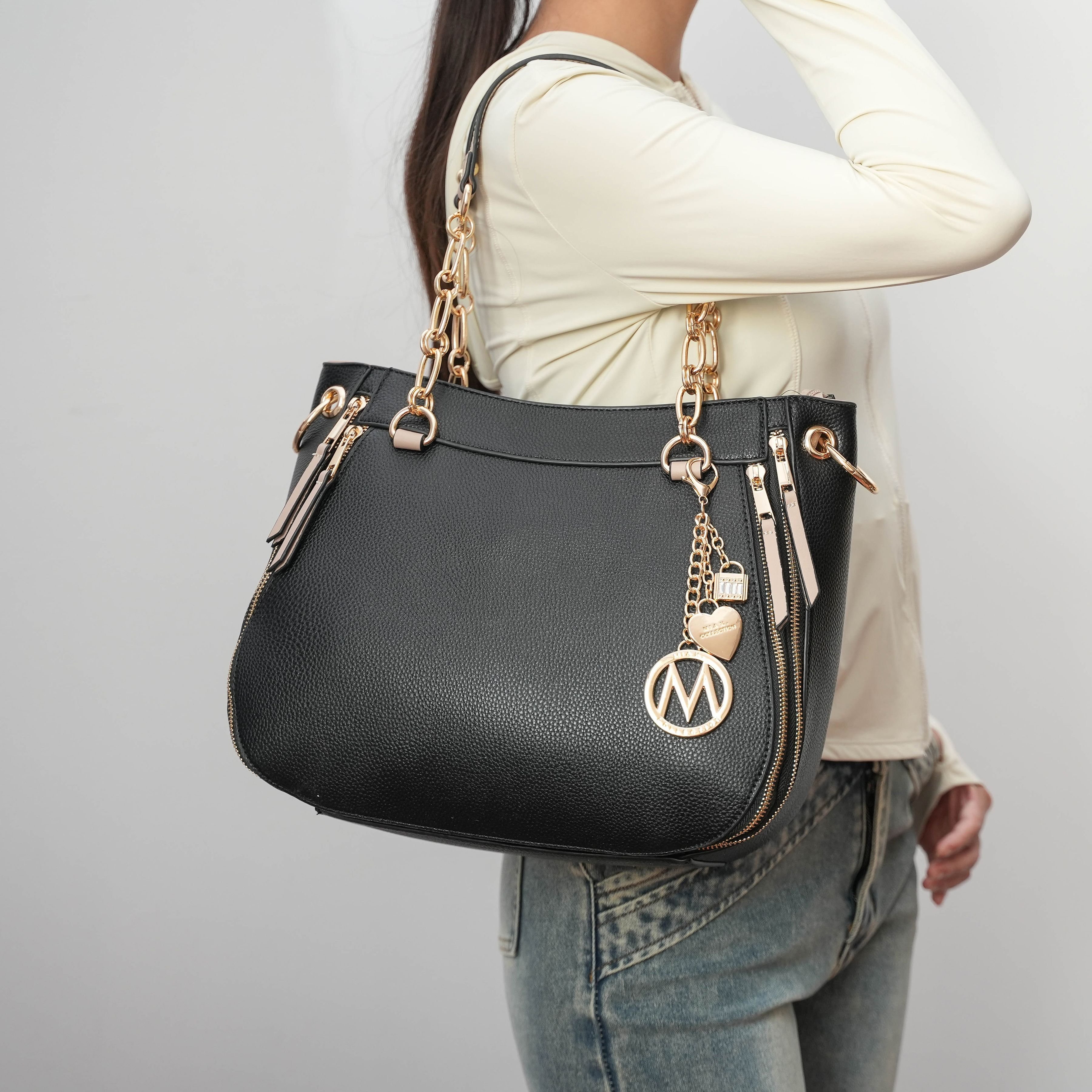 The Lina Shoulder Bag is a stylish and functional accessory crafted from durable, textured vegan leather and accented with luxurious gold-tone hardware. Its structured yet chic silhouette features a secure zip-top closure and a removable decorative keychain, adding a sophisticated touch. The spacious, fabric-lined interior includes a zippered pocket and two slip-in pockets, offering ample storage for essentials. On the exterior, a back zippered pocket provides easy access to necessities, while two large front zippered compartments enhance organization and convenience. Additionally, two decorative front zippered pockets elevate its refined aesthetic. Complete with a matching wallet, this versatile and stylish shoulder bag is perfect for work, travel, or daily use, effortlessly blending fashion and functionality.